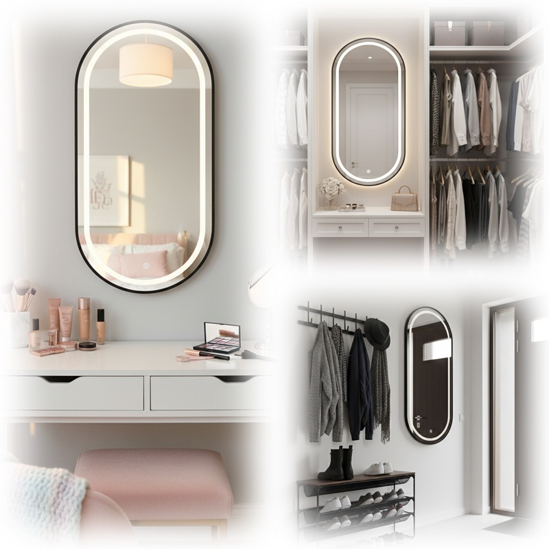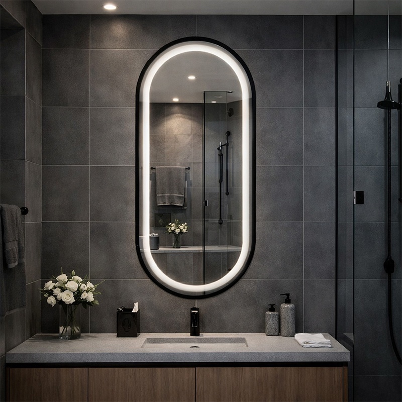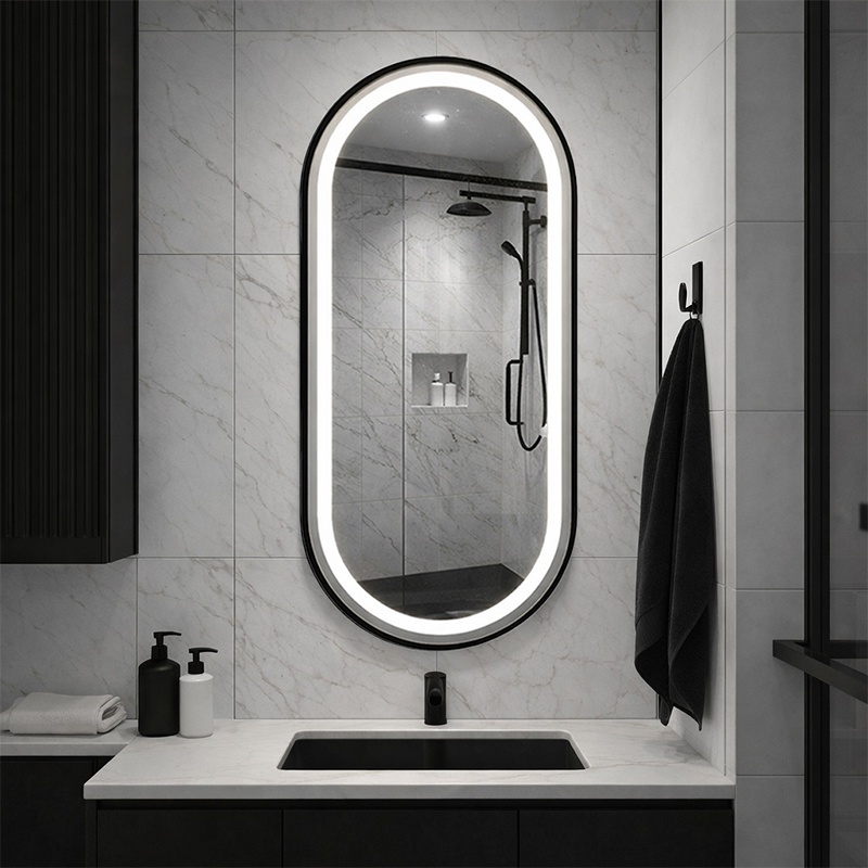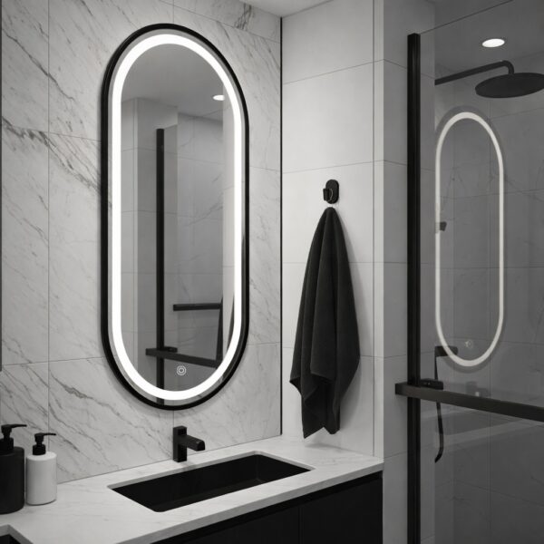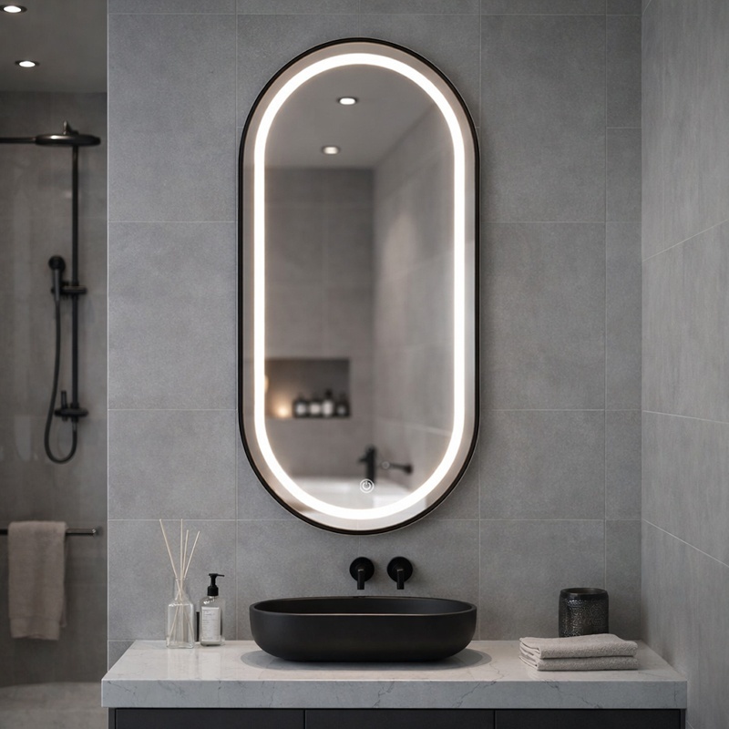 The LED mirror combines decorative and lighting functions, keeping the wall visually clean and uncluttered.