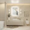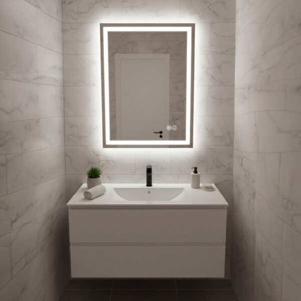 The LED mirror combines decorative and lighting functions, keeping the wall visually clean and uncluttered.