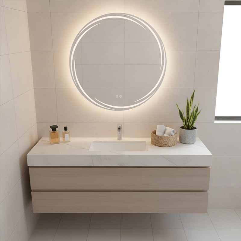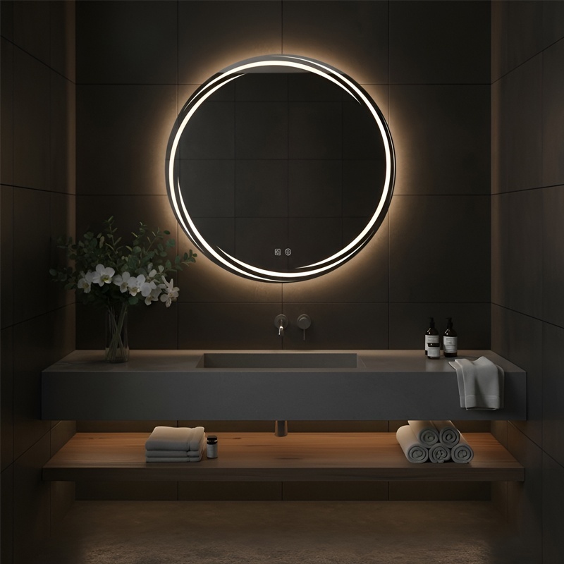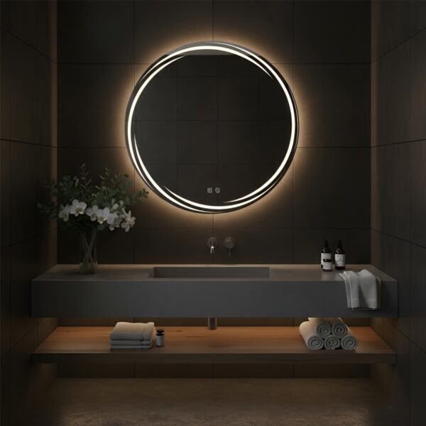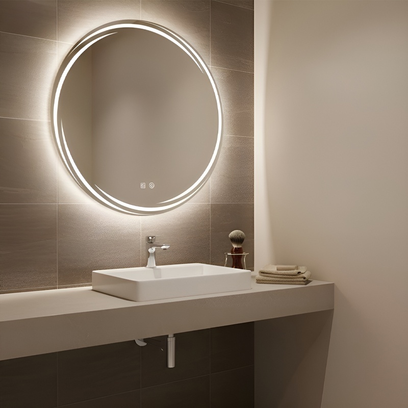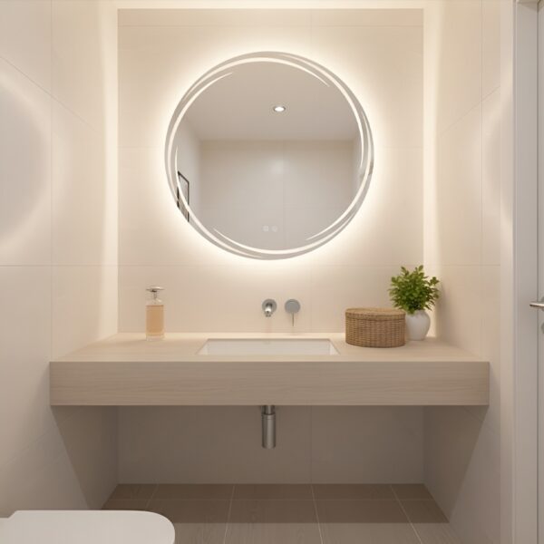 The LED mirror combines decorative and lighting functions, keeping the wall visually clean and uncluttered.