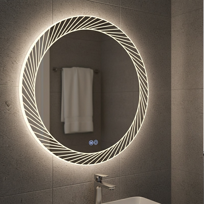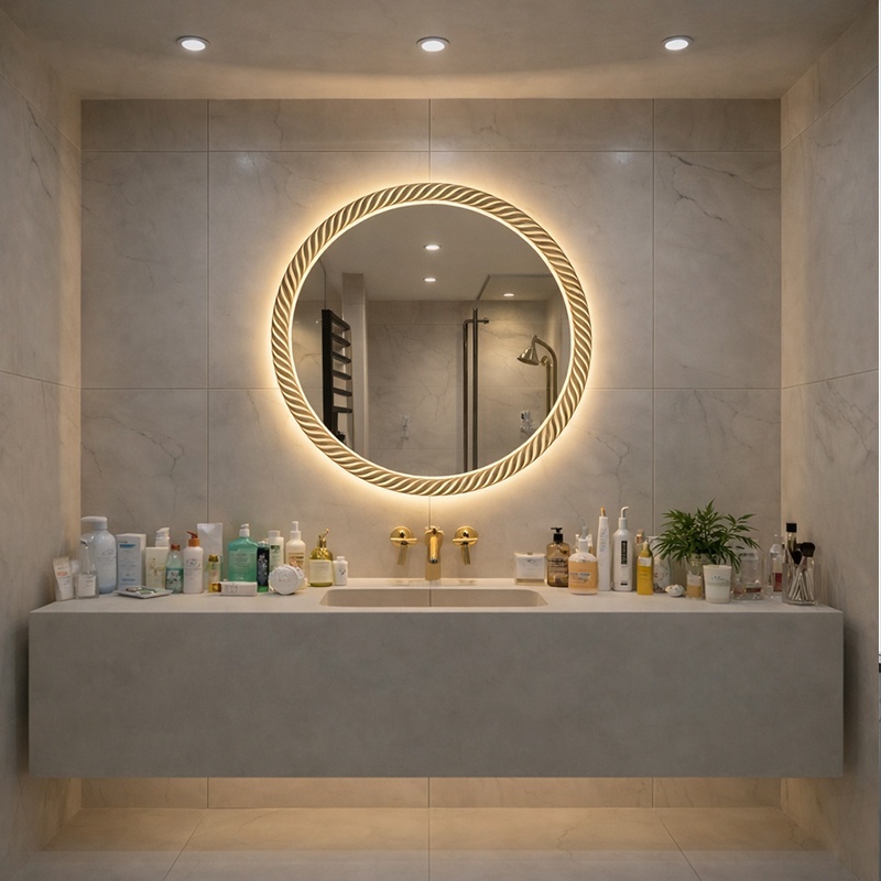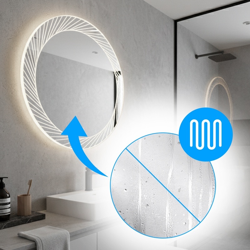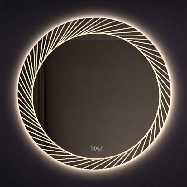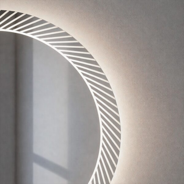 The LED mirror combines decorative and lighting functions, keeping the wall visually clean and uncluttered.