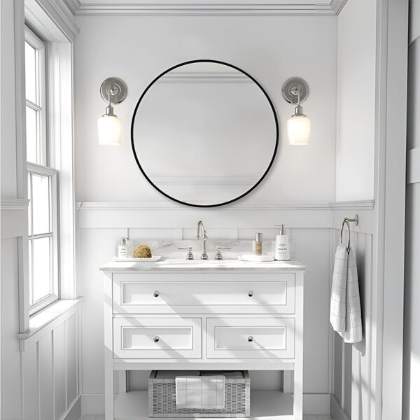 The minimalist form and neutral finish make the mirror suitable for a wide range of bathroom styles – from industrial to classic. It complements the arrangement without visually overpowering it.