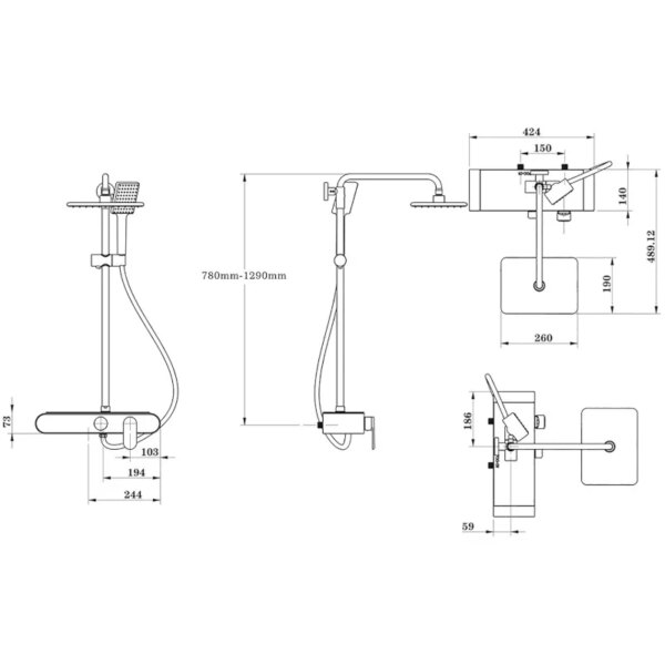 Switch: manual PUSH ON – hand shower, spout, overhead shower