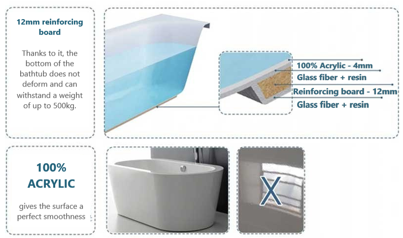 Thanks to reinforced construction, the bathtub is extremely strong and can easily withstand loads of up to 500 kg.