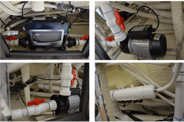 Two ball valves are installed next to the circulating pump and the heater, so that in case of failure of a given part, it can be turned off and replaced without the need to drain the water from the bathtub.
