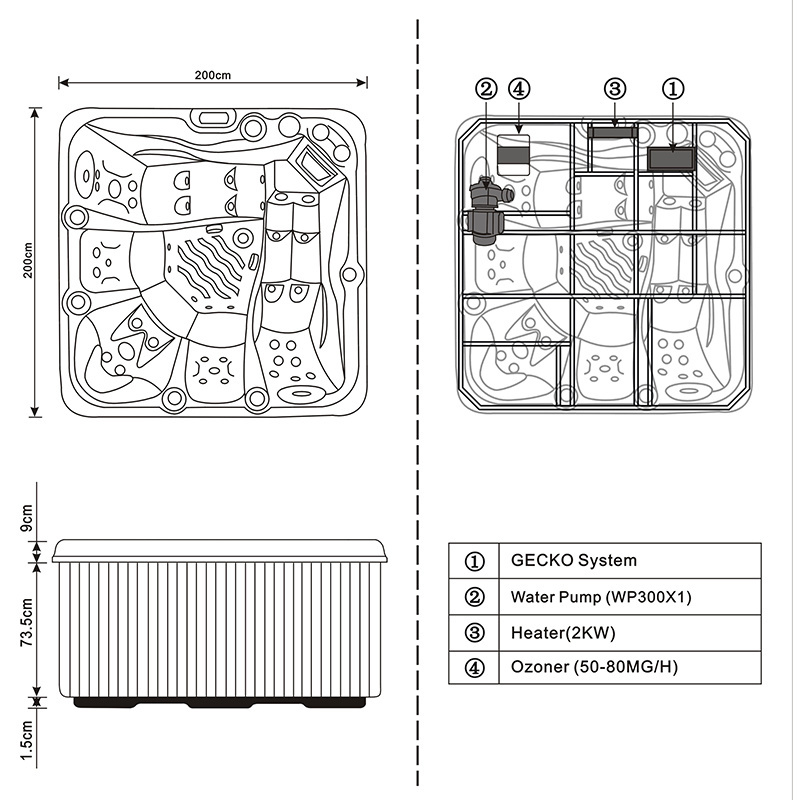 Hydromassage pump: Dual‑speed JET pump – 1 × 3.0 HP (2.20 kW) massage mode, 0.5 HP (0.35 kW) filtration & heating mode