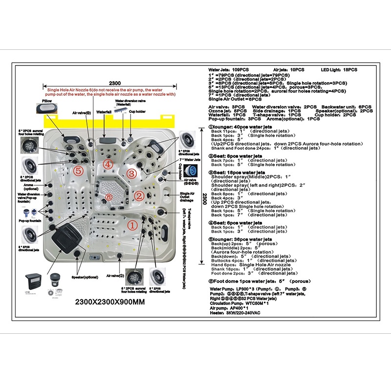 LED water flow control valves: 2 pcs (redirect full massage power to occupied seats)