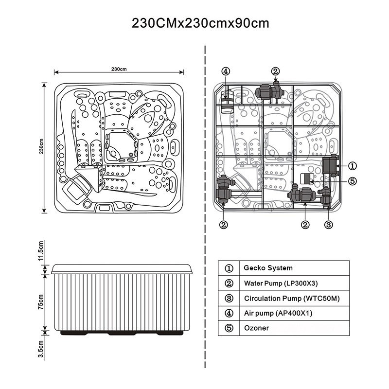 Hydromassage pumps: 3 × 3.0 HP (2.25 kW each)