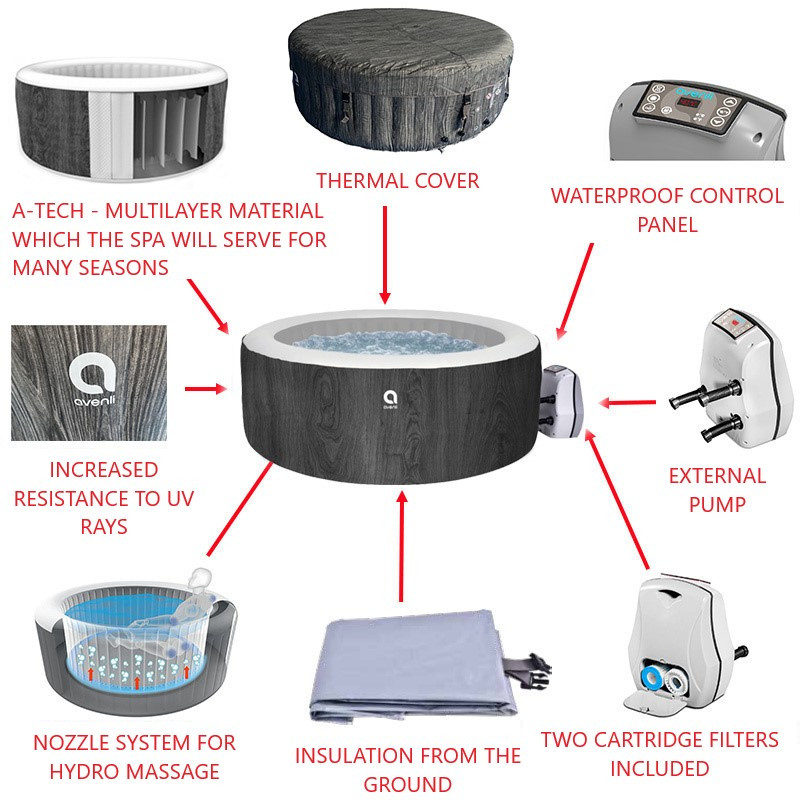 - Quality and affordable price: AVENLI garden jacuzzi is characterized by thick, inflatable walls that provide comfortable support for the back during bathing. The set includes a filter pump with a filter cartridge and a heater to warm the water to 40 degrees Celsius. The kit also includes a protective cover against dirt and curious animals, an inflatable hose, an RCD plug, an airflow valve, ground insulation, a filter container, pump connectors, repair kit.