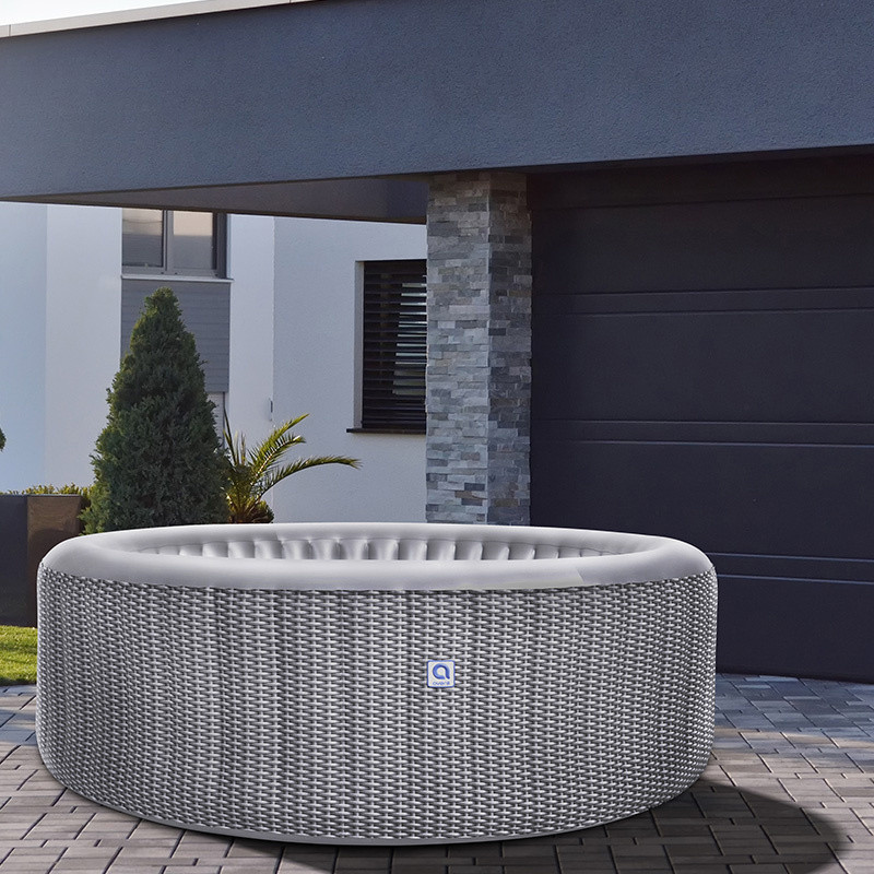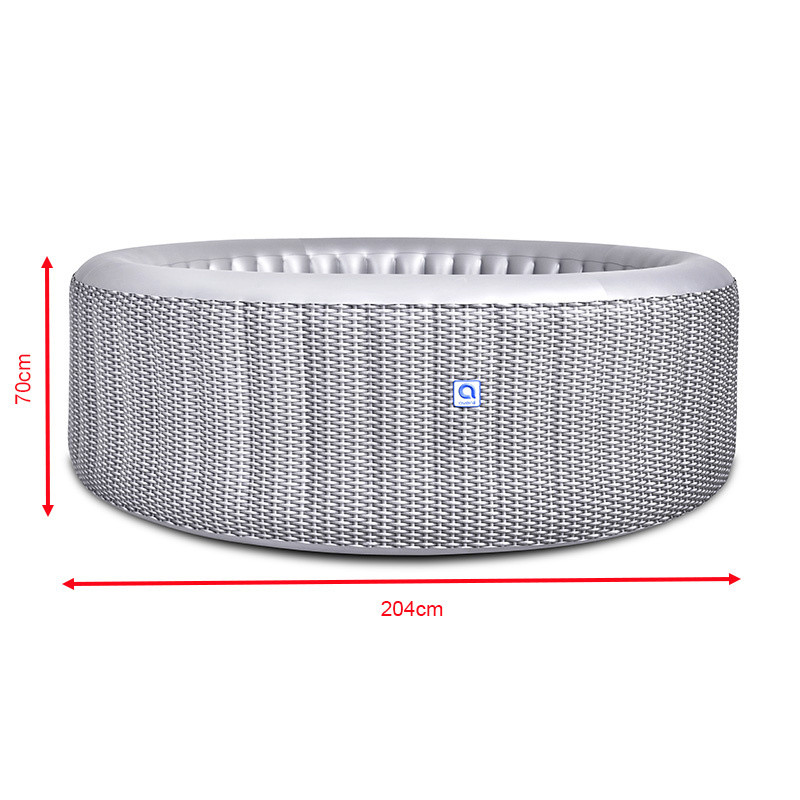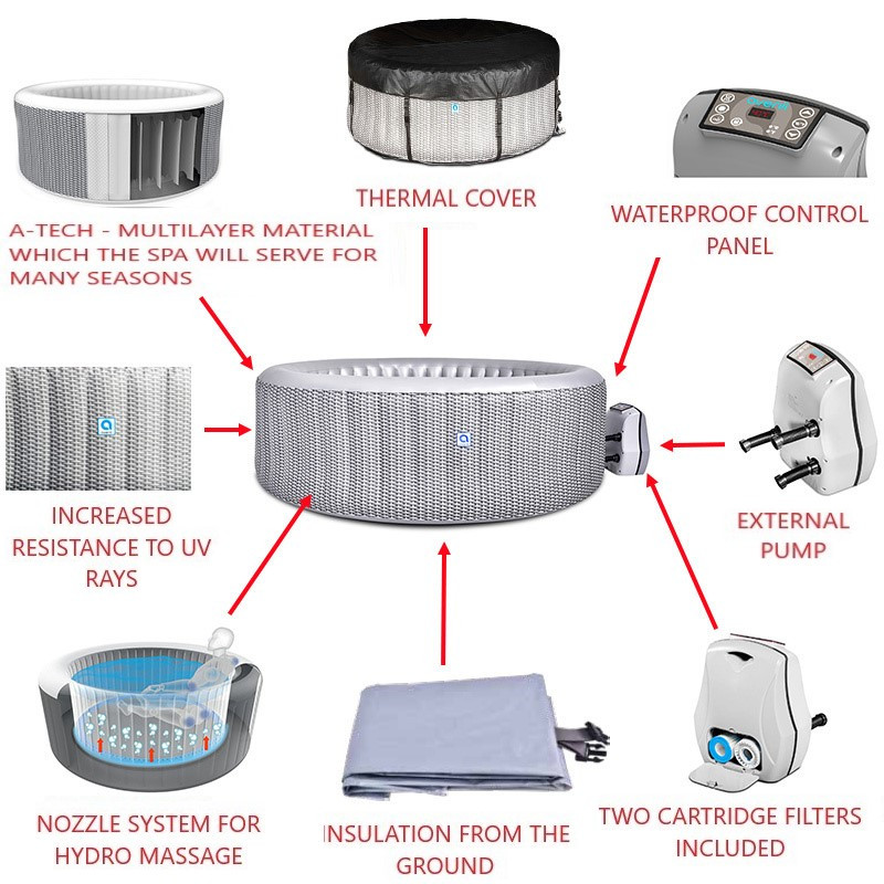 - Quality and affordable price: AVENLI garden jacuzzi is characterized by thick, inflatable walls that provide comfortable support for the back during bathing. The set includes a filter pump with a filter cartridge and a heater to warm the water to 40 degrees Celsius. The kit also includes a protective cover against dirt and curious animals, an inflatable hose, an RCD plug, an airflow valve, ground insulation, a filter container, pump connectors, repair kit.