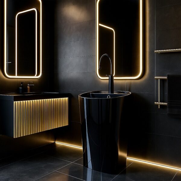 The minimalist monolithic pedestal form makes the basin a perfect match for elegant and contemporary bathroom interiors.