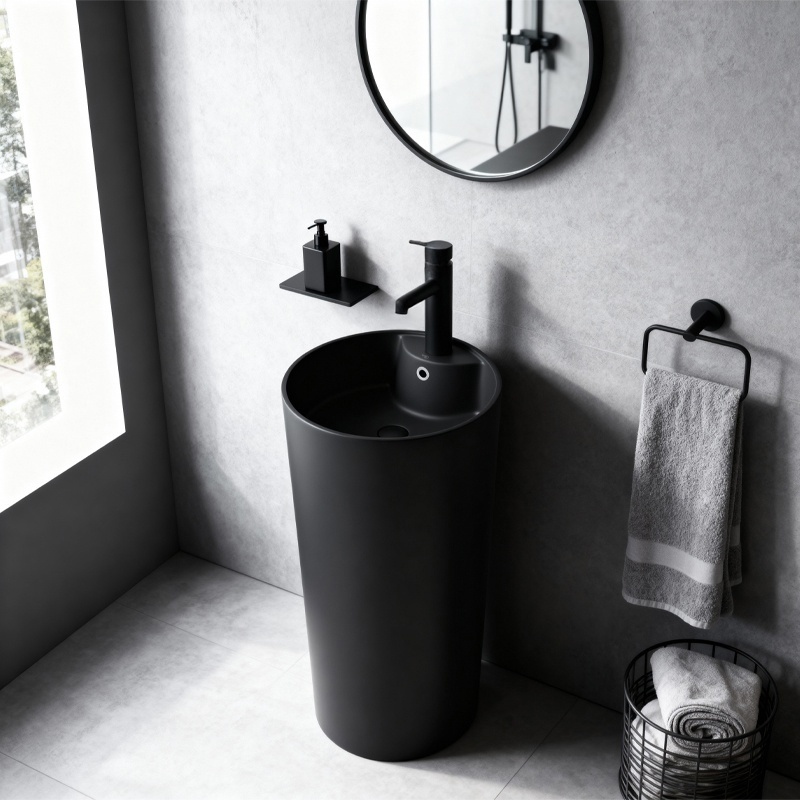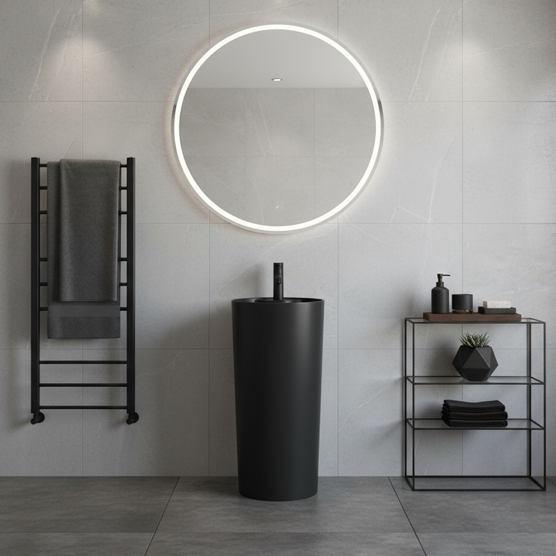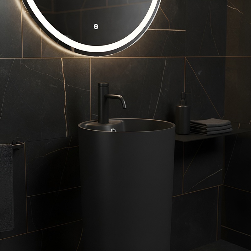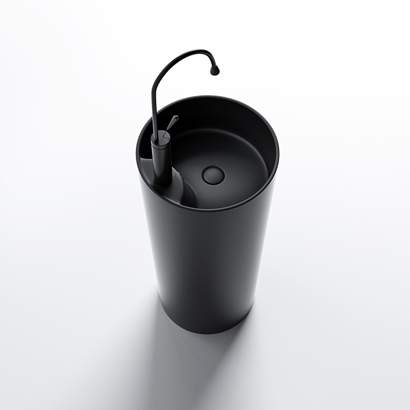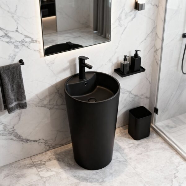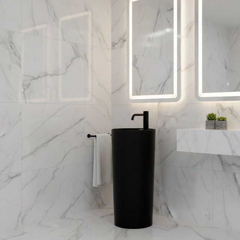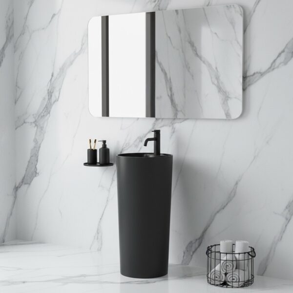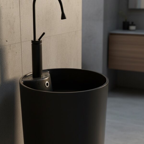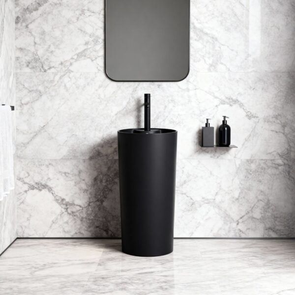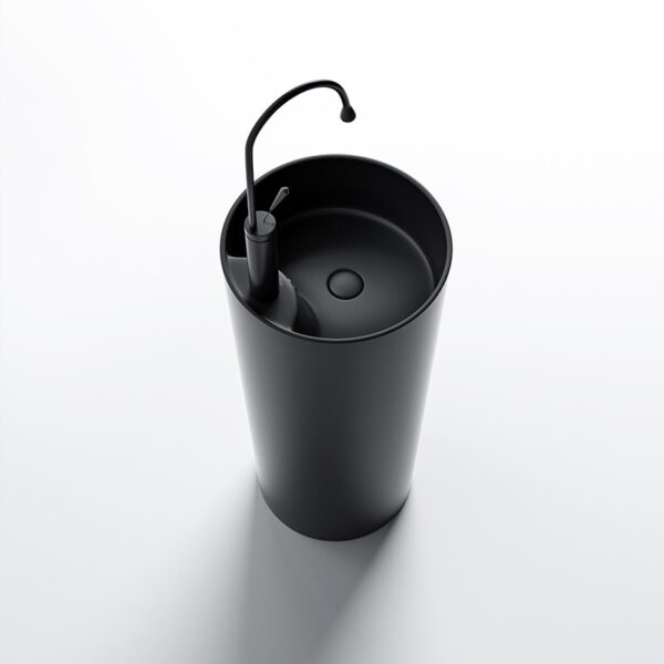 The CORRINE freestanding ceramic basin is a unique monolithic pedestal design that perfectly combines modern aesthetics with everyday functionality. Its minimalist yet elegant style blends seamlessly into any carefully designed bathroom interior.