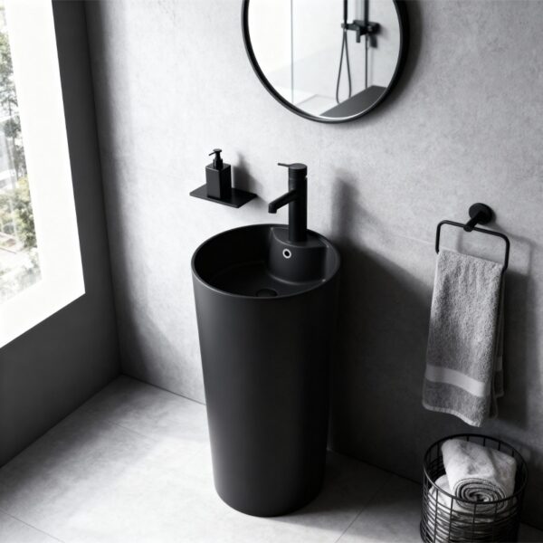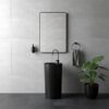 A minimalist monolithic pedestal form perfectly complements elegant, contemporary bathroom arrangements.