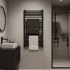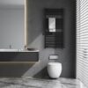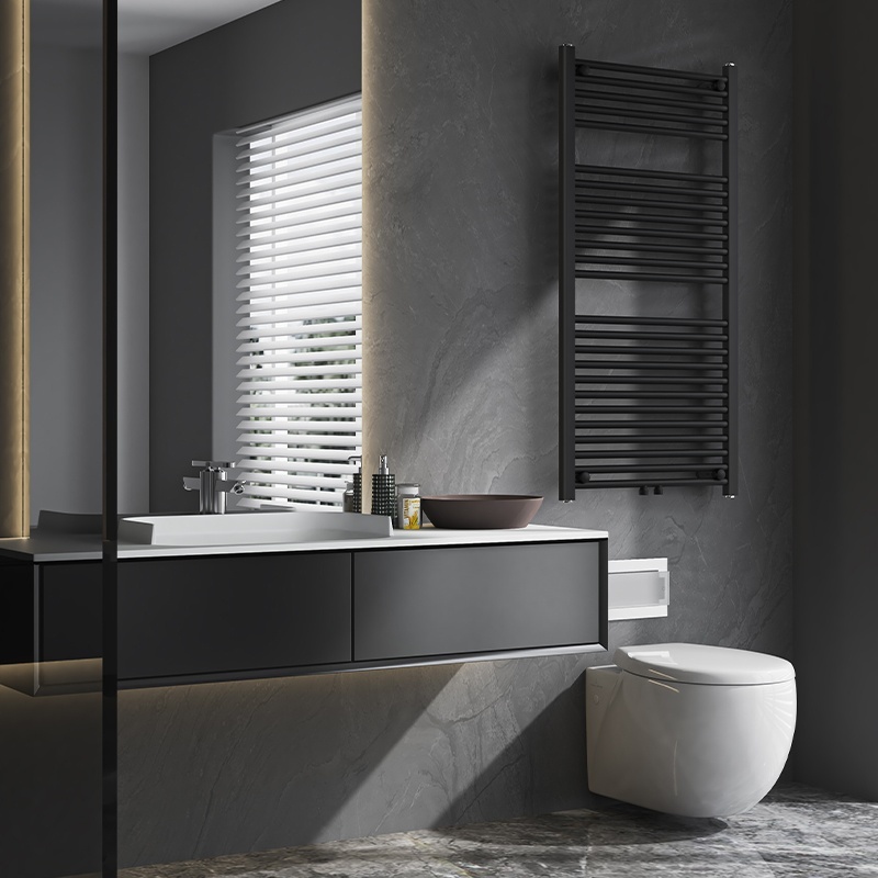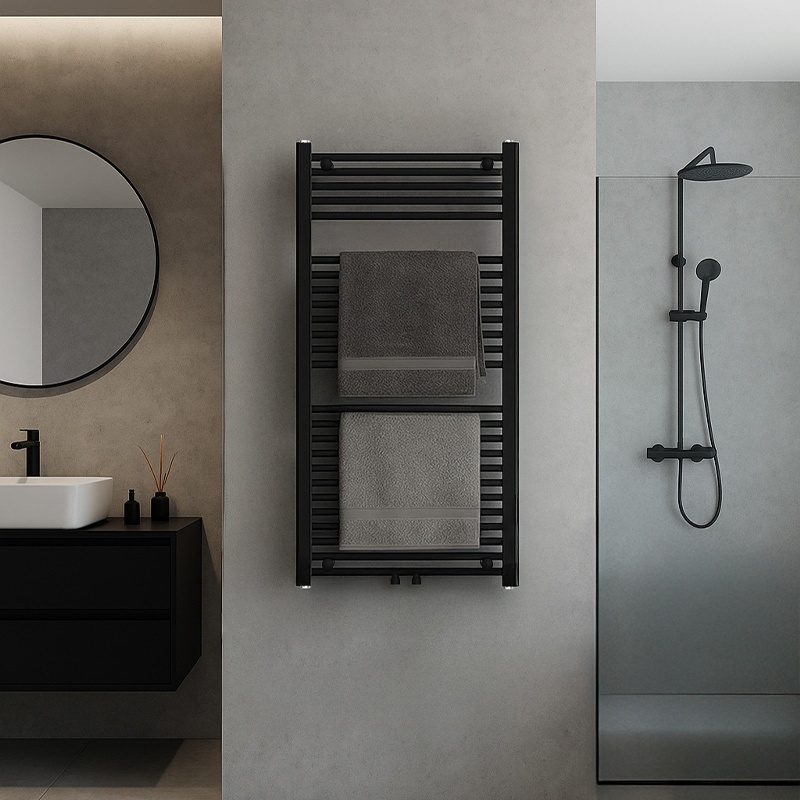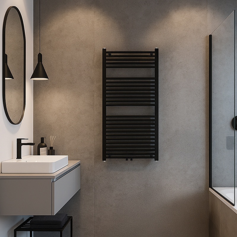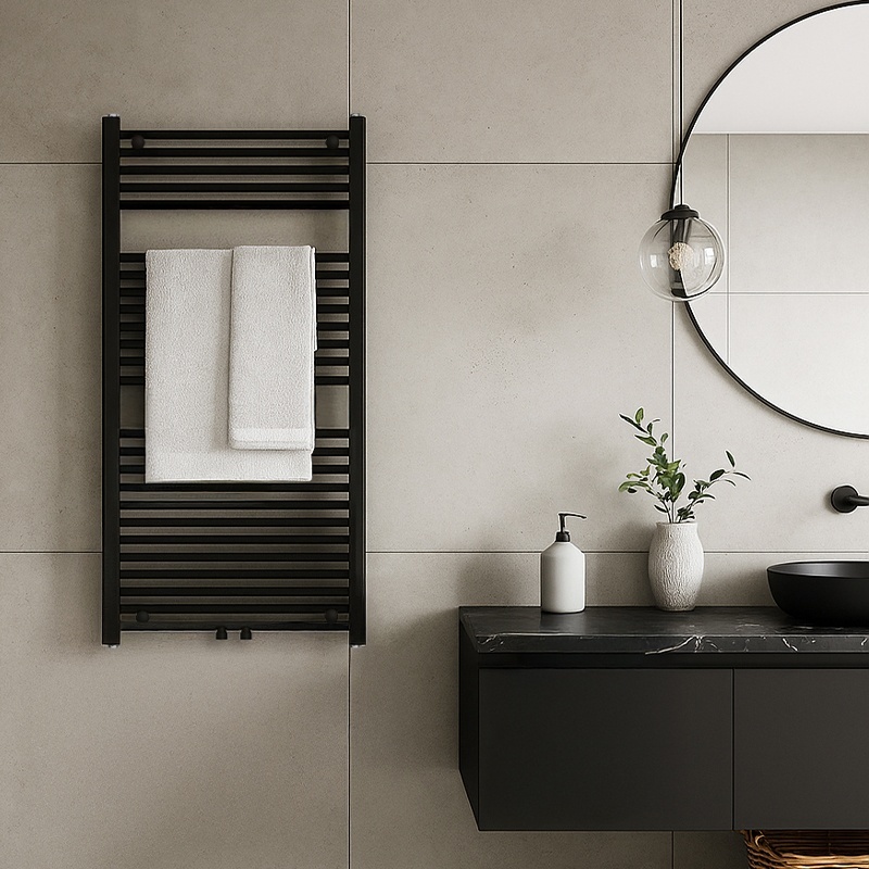 The wall-mounted bathroom radiator is an elegant and practical heating solution suitable for all types of bathrooms. Made of durable steel and finished in a modern matte black, it perfectly complements contemporary interiors, enhancing their sophisticated look.