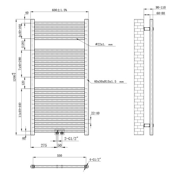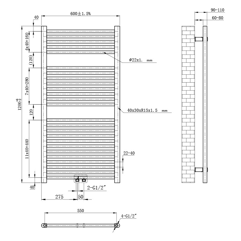 Equipped with four G1/2” connections (spacing 550 mm) and two G1/2” connections (spacing 50 mm) in the bottom center, the radiator can be installed on either side, offering great flexibility during installation.