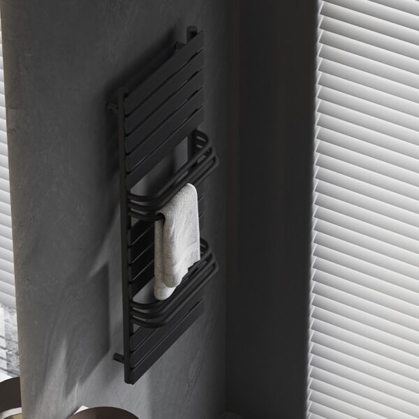 Equipped with 18 horizontal heating bars, the radiator provides a large heat-emitting surface and effectively warms the entire bathroom. The arrangement of the bars allows not only quick heating but also easy towel or clothing drying — particularly thanks to the open central zone for convenience.