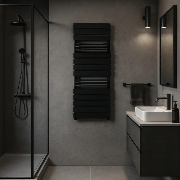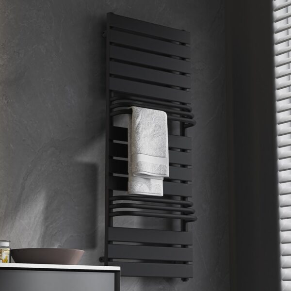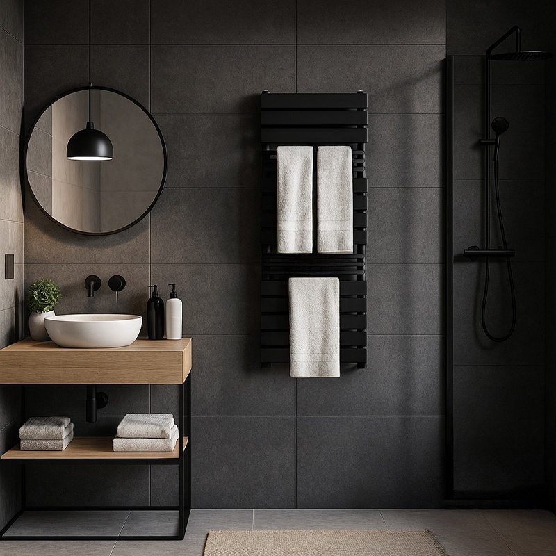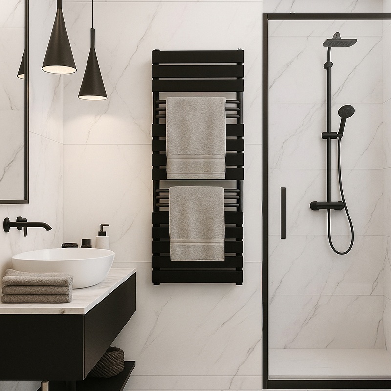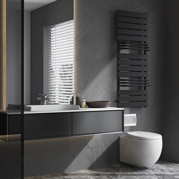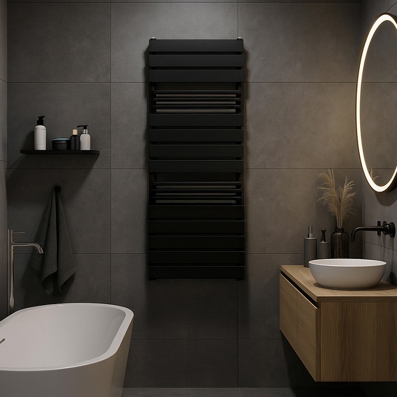 The FUEGO-BL radiator was created for modern interiors, combining aesthetics with functionality. Its horizontal profiles form a clean, geometric design that blends perfectly with both minimalist and classic bathroom styles. The matte black finish adds elegance and emphasizes the character of the entire interior.