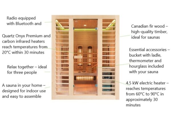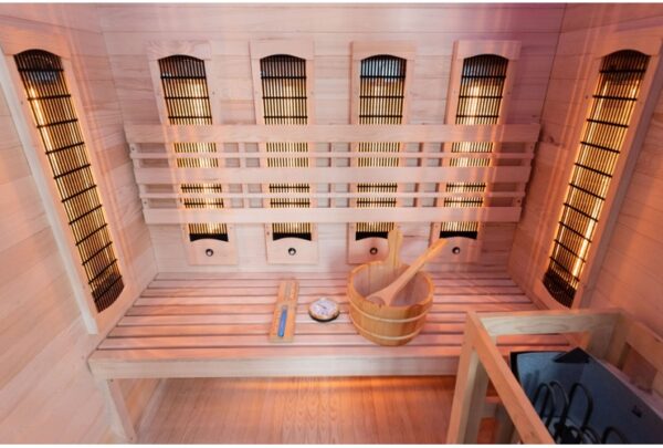 The electric stove heats the air up to 90°C, while the quartz infrared heaters allow sessions at temperatures of up to 60°C.