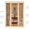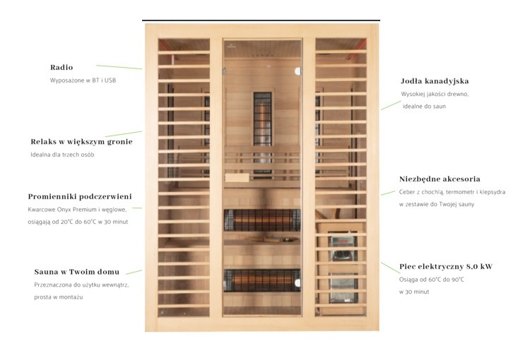 The sauna is equipped with 9 Quartz Onyx Premium infrared heaters with a total output of 2900 W, operating in a temperature range of 20°C to 60°C. The heaters are strategically positioned to deliver maximum health benefits, including improved circulation, body detoxification, and relief from muscle and joint pain.