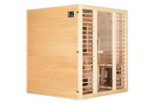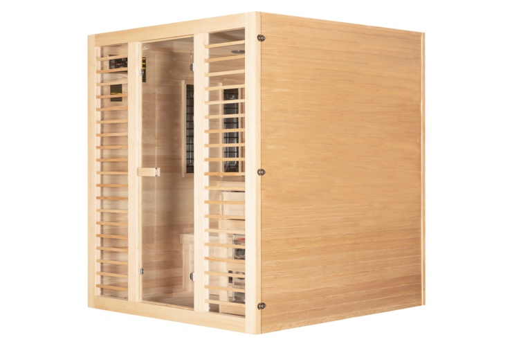 Made from Canadian fir wood, the sauna combines Finnish and infrared technology in one unit. Enjoy the benefits of a Finnish sauna one day, and the next day focus on muscle recovery or pain relief using infrared heaters. The stove heats the air up to 90°C, while the quartz infrared heaters provide sessions at temperatures of up to 60°C.