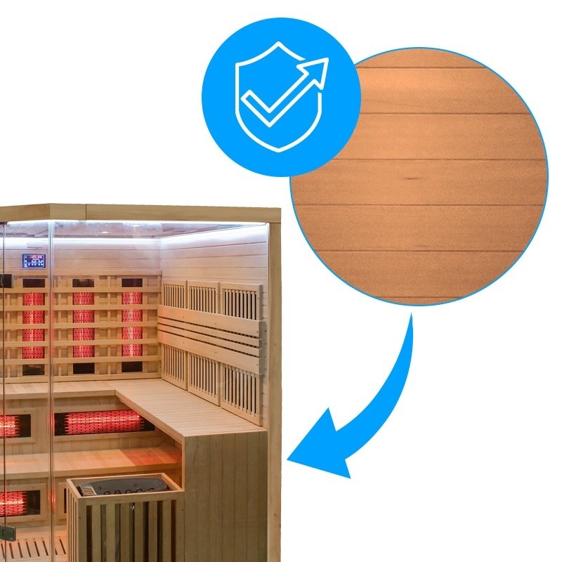 We recommend protecting the sauna interior with paraffin oil designed for saunas, which helps maintain cleanliness and can extend the lifespan of the wood.