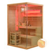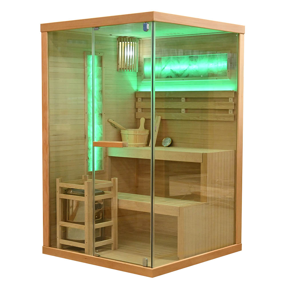 Compact dry sauna (Finnish type) designed for indoor use, combining natural Canadian Hemlock wood with efficient heating performance. Its space-saving dimensions make it ideal for private homes while comfortably accommodating two seated persons.