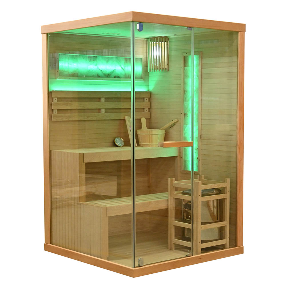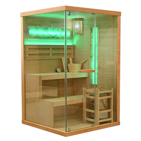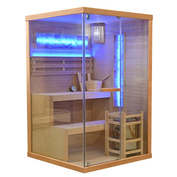 Compact dry sauna (Finnish type) designed for indoor use, combining natural Canadian Hemlock wood with efficient heating performance. Its space-saving dimensions make it ideal for private homes while comfortably accommodating two seated persons.