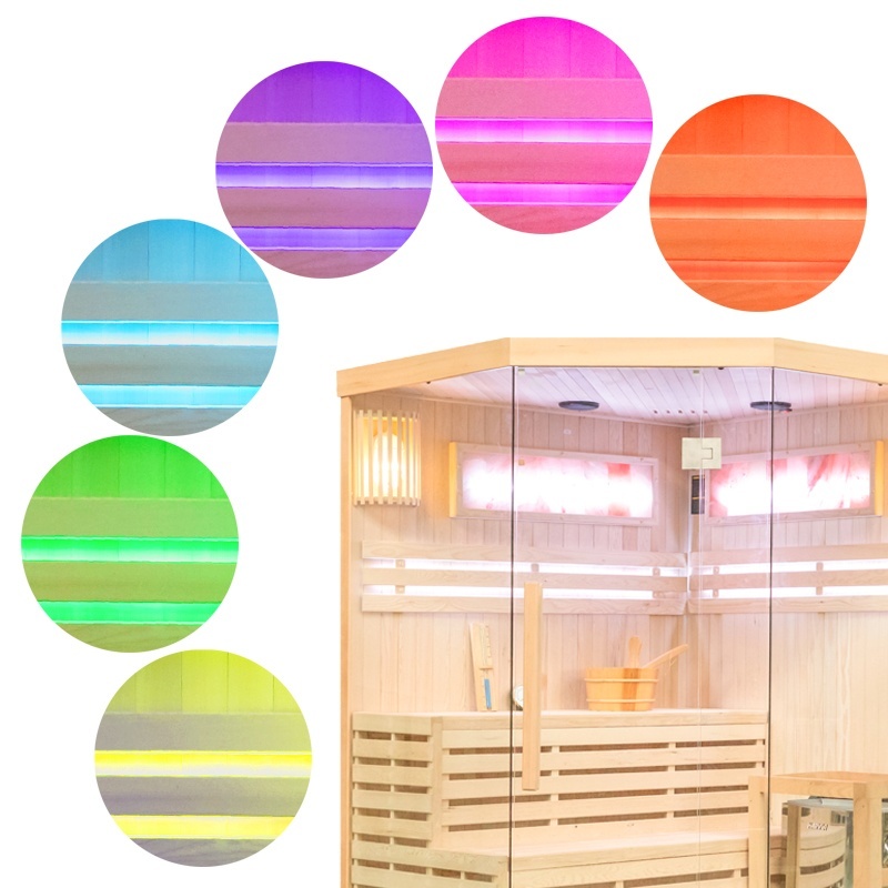 LED chromotherapy lighting: multicolour lighting across the full width of the sauna at backrest level, 7 colours