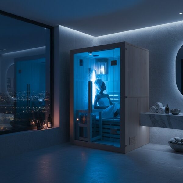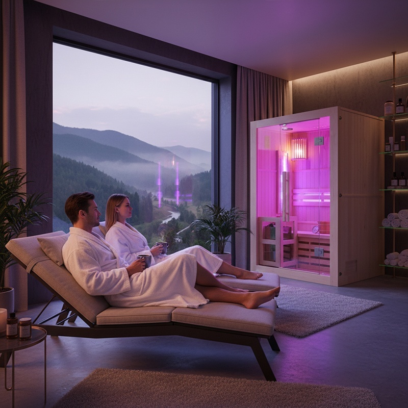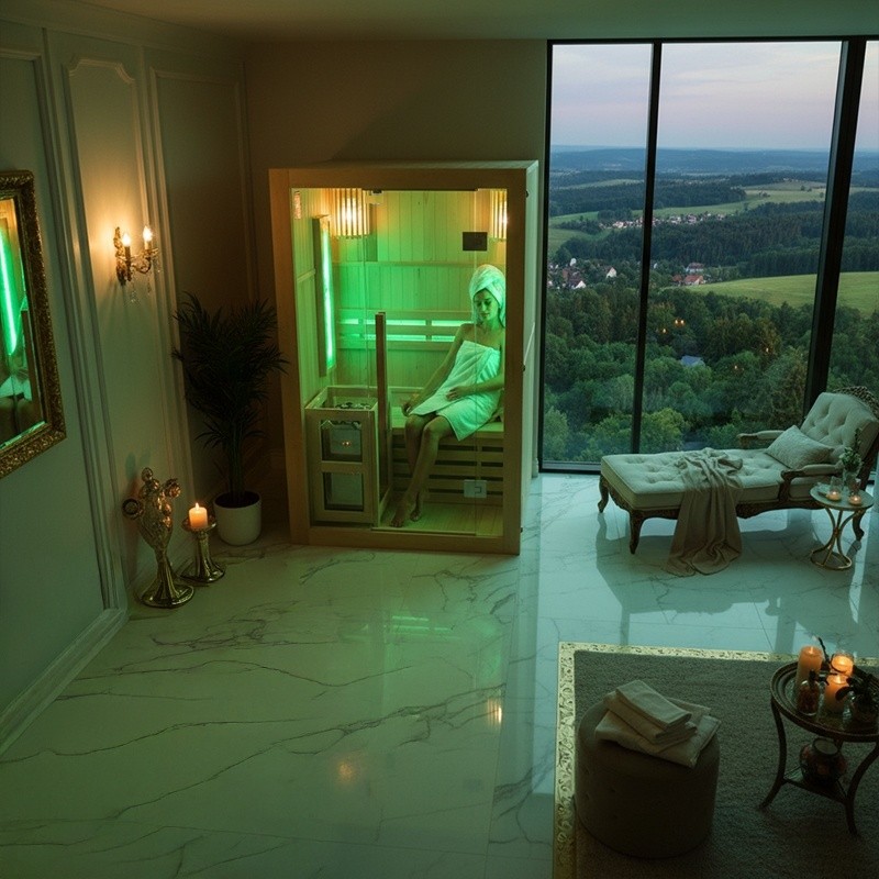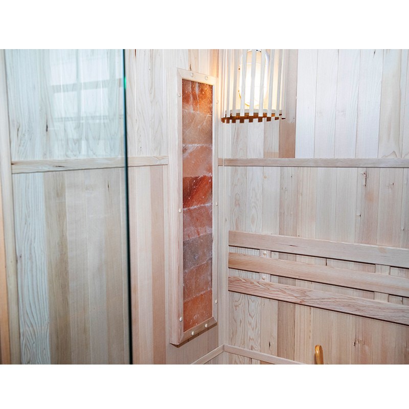 A built-in Bluetooth module with speakers allows easy connection to mobile devices, enabling you to enjoy music or ambient sounds during each sauna session. Two large Himalayan salt panels create a unique visual effect and support respiratory comfort and skin condition.