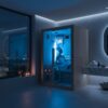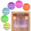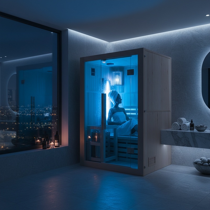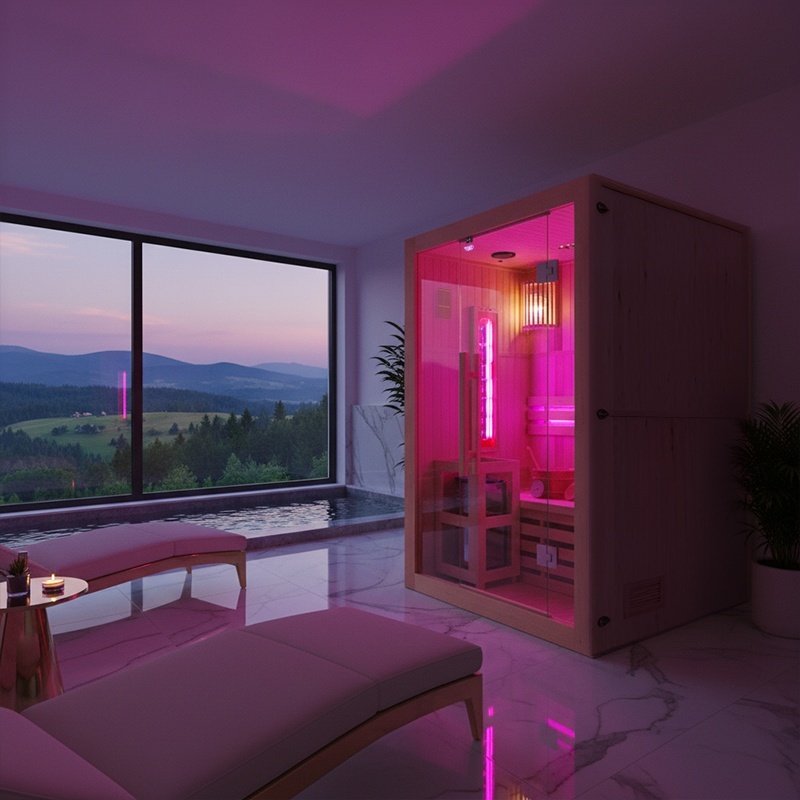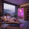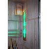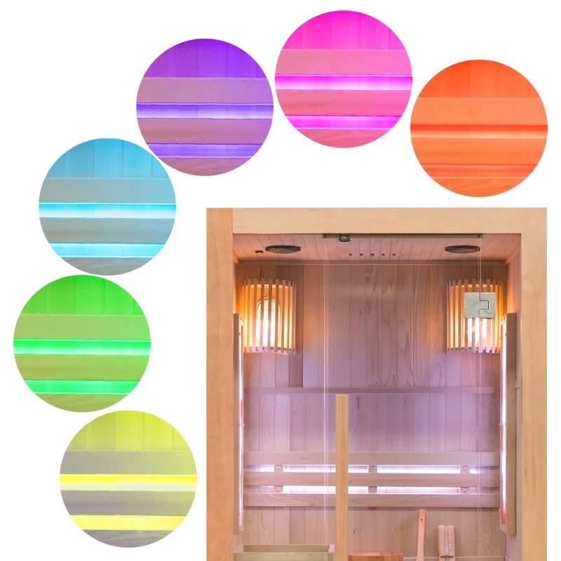 The sauna features LED chromotherapy lighting running along the full width of the backrest area. Adjustable colour lighting (7 colours) supports relaxation, mental balance, and regeneration.