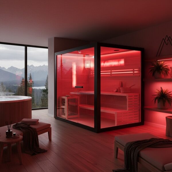 Comfortable seating made from Canadian fir ensures durability and comfort during frequent use. The sauna is additionally equipped with two large Himalayan salt panels, enhancing both the visual ambience and the air quality inside the cabin.