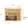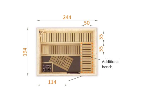 Includes: 2x benches, stove casing, 2x headrest, platform, lighting, stove
