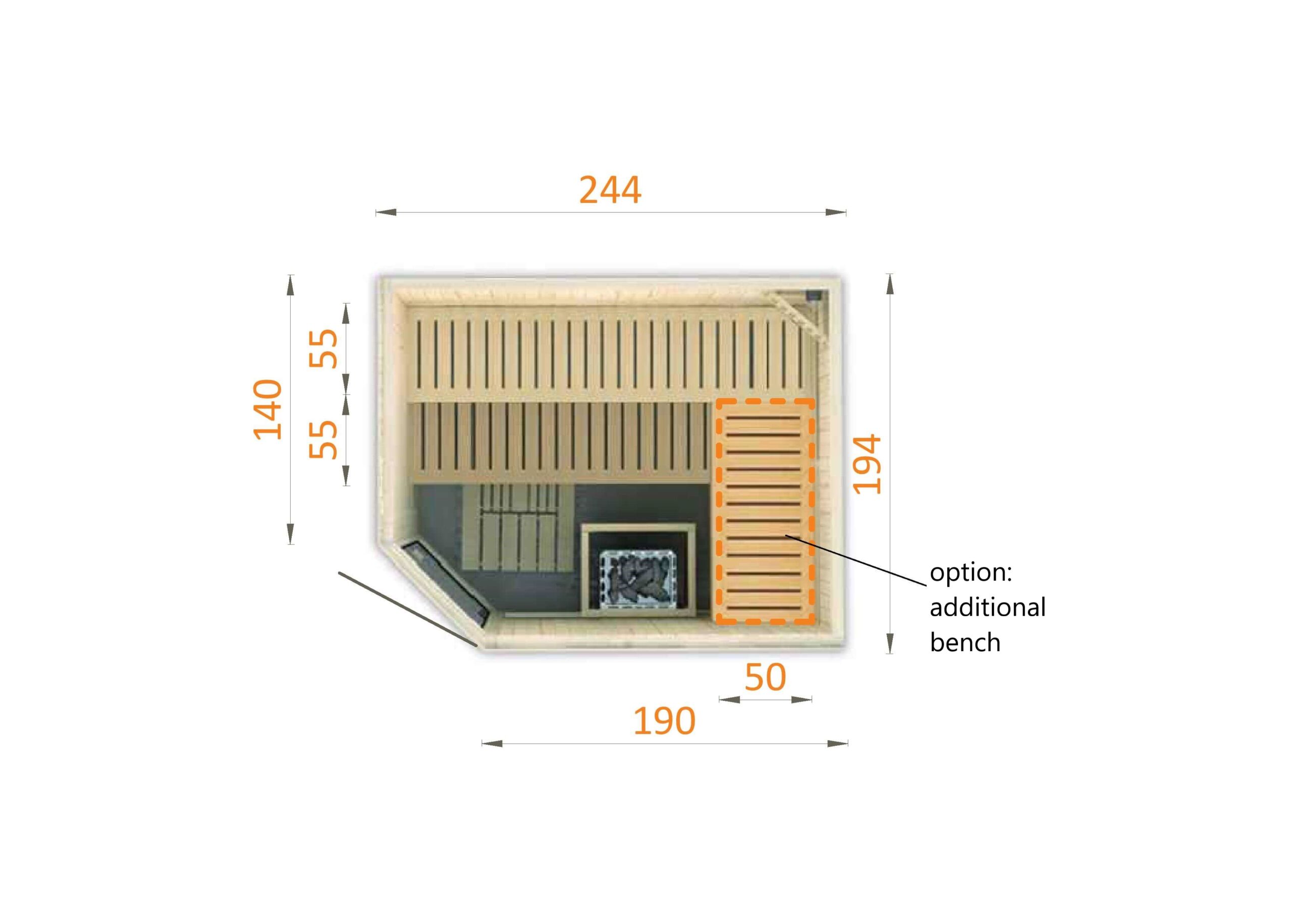 Includes: 2 benches, stove, stove housing, 2x headrest, platform, lighting