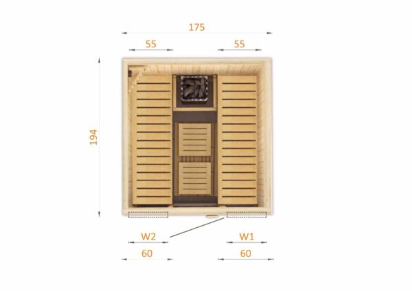 Includes: 2x benches, stove, stove housing, 2x headrest, platform, lighting