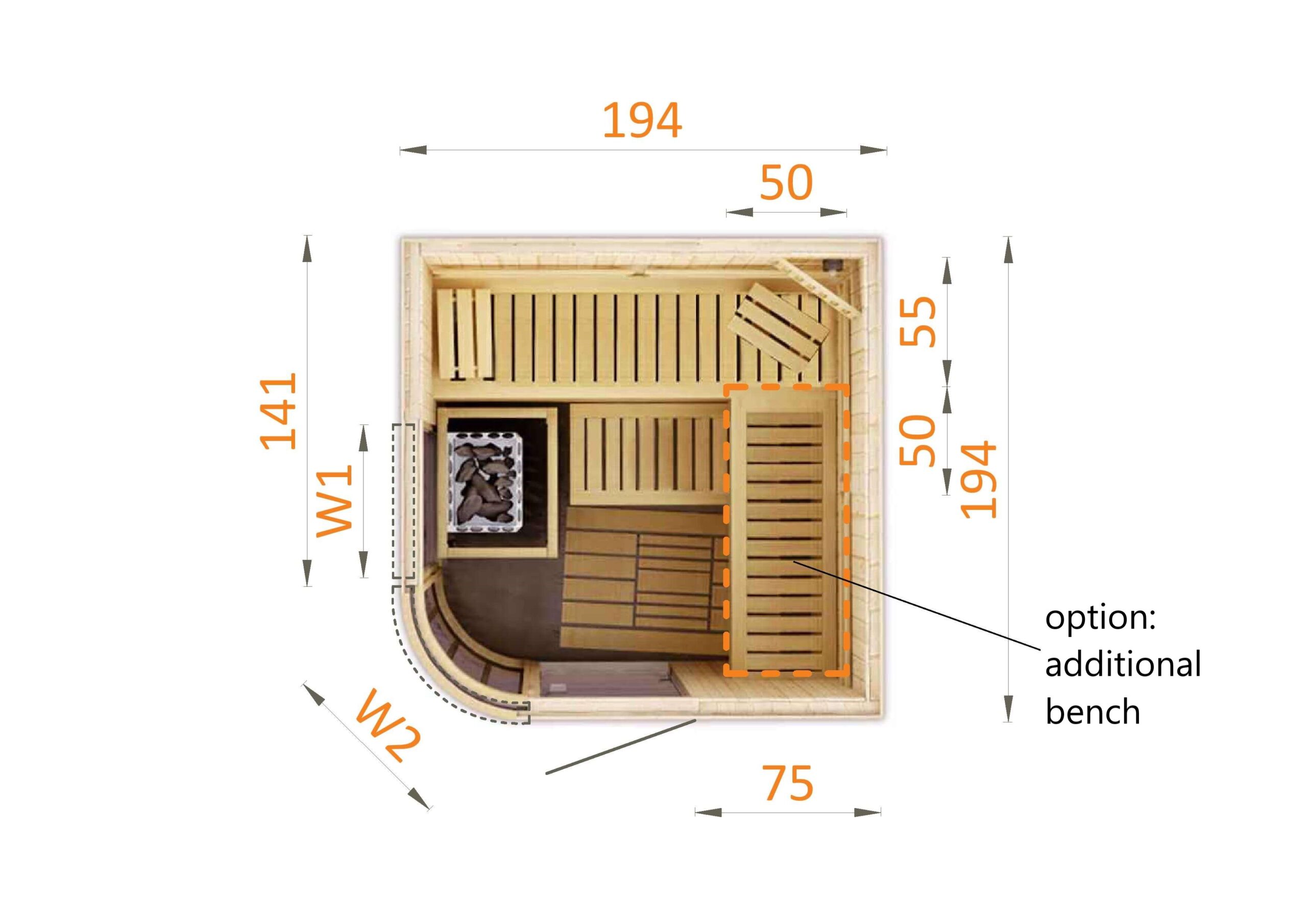 Includes: 2 benches, stove, stove housing, 2x headrest, platform, lighting