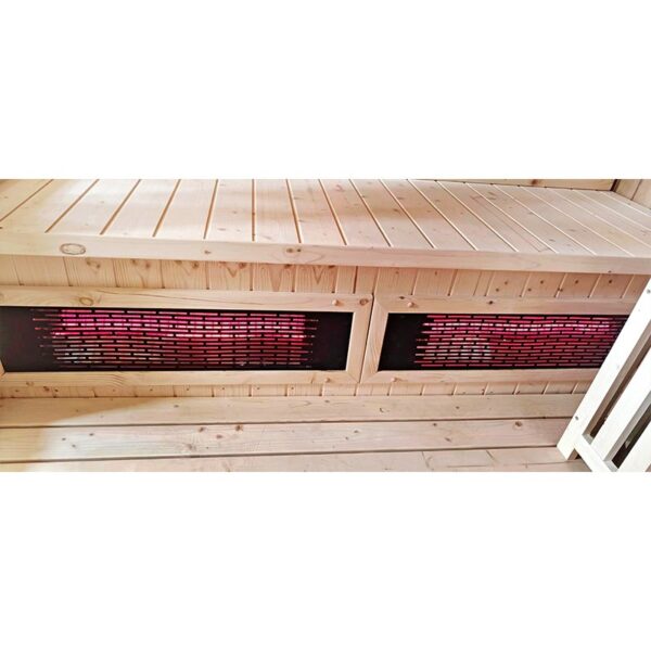 Equipped with a powerful Harvia 8kW heater, 12 innovative quartz infrared heaters with a total power of 4200W, and 2 carbon heaters with a combined power of 400W, it delivers deep and evenly distributed heat for a rejuvenating experience.