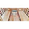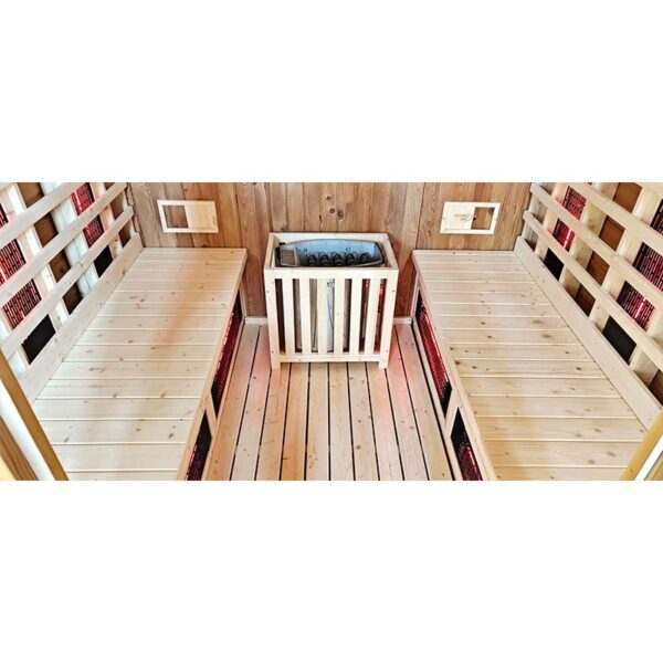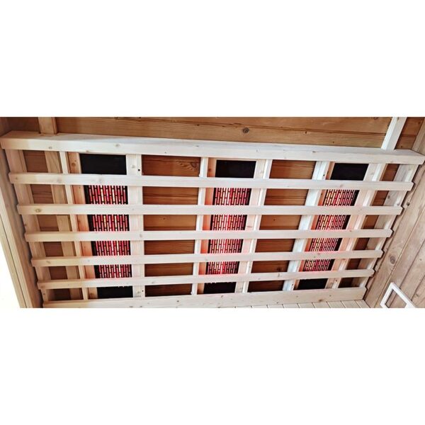 The modern control panel, featuring Bluetooth connectivity and mobile app control for the infrared heaters, adds unparalleled convenience. Comfortable wooden seating completes the relaxing ambiance. Additionally, the integrated LED chromotherapy system allows you to customize your experience by harnessing the power of color therapy to positively impact your mood and well-being.