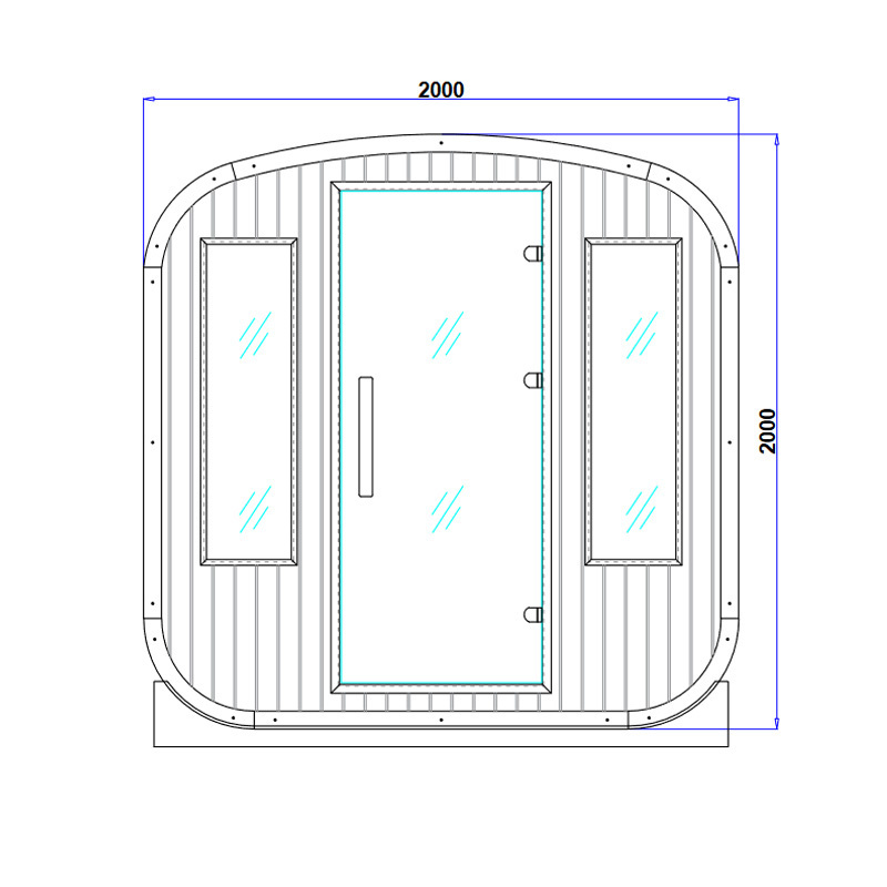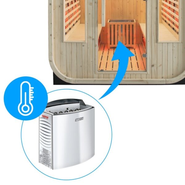 The sauna is equipped with an efficient Harvia heater with 8 kW output as well as innovative infrared heaters with a total power of 3.5 kW, providing deep and evenly distributed heat. A modern control panel with Bluetooth and Wi-Fi, operated via a mobile app, allows convenient control of the infrared heaters, lighting, and music, enhancing overall comfort and ease of use.