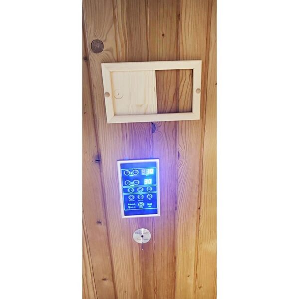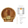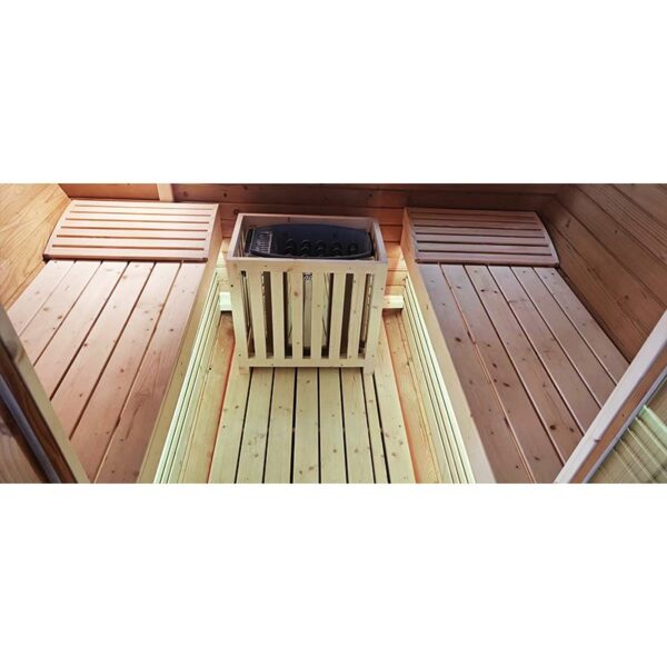 The sauna is also equipped with accessories such as a bucket, ladle, sand timer, thermo-hygrometer, and heater stones, ensuring perfect conditions for relaxation.