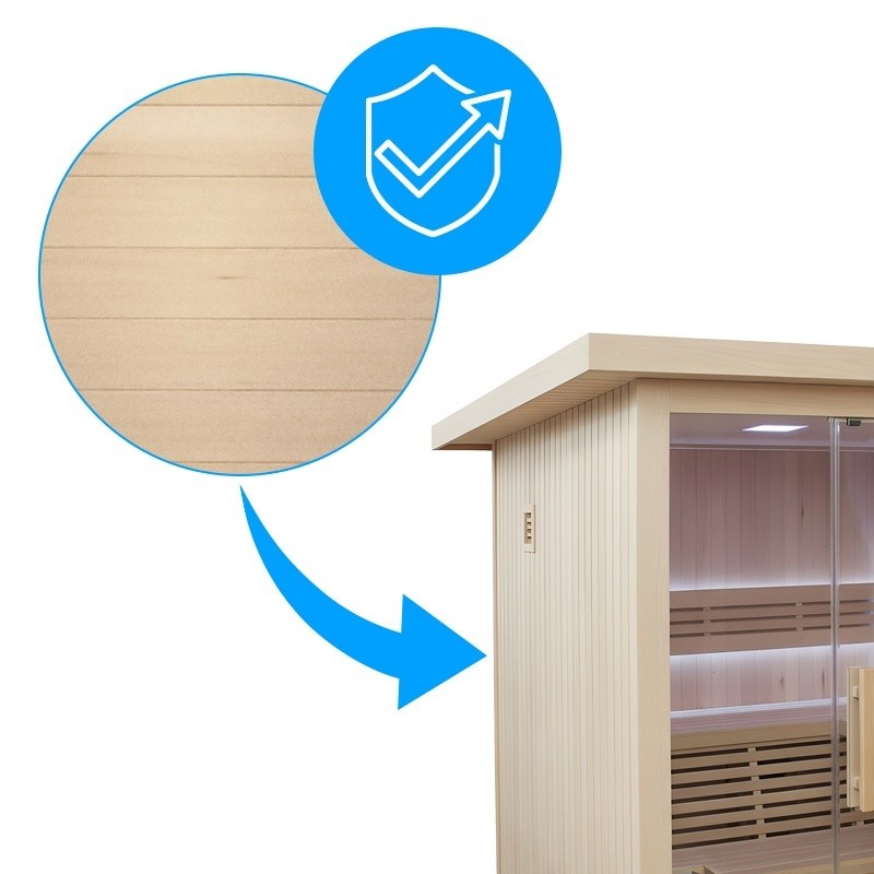 Note: We recommend external impregnation of the sauna after installation. Failure to protect the wood will result in accelerated material wear. The interior of the sauna should be treated with paraffin oil intended for saunas, which makes cleaning easier and may additionally extend the durability of the wood.