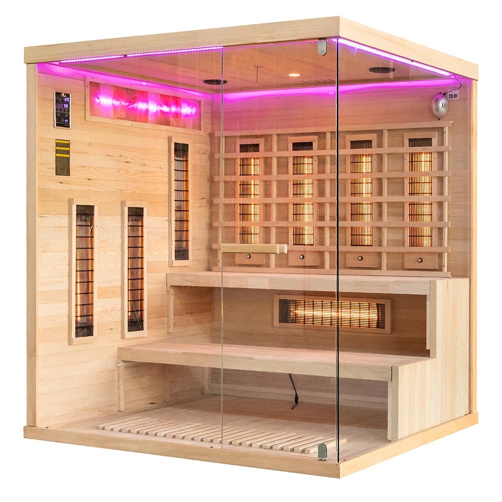 The model with dimensions 1750×1400×2000 mm is equipped with 8 heaters in total, including 8 quartz heaters (300 W each) and 1 carbon heater (180 W, floor-mounted). The sauna is also enriched with Himalayan salt stone panels and modern LED chromotherapy, creating a unique atmosphere for relaxation and wellness.