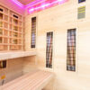 The model with dimensions 1750×1400×2000 mm is equipped with 8 heaters in total, including 8 quartz heaters (300 W each) and 1 carbon heater (180 W, floor-mounted). The sauna is also enriched with Himalayan salt stone panels and modern LED chromotherapy, creating a unique atmosphere for relaxation and wellness.
