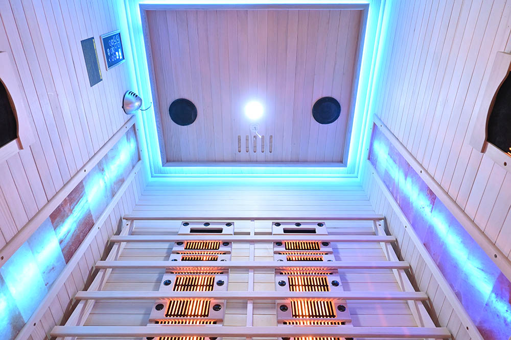 Atmospheric lighting and chromotherapy – Interior LED lighting and illuminated Himalayan salt panels (7 colors) enhance the atmosphere and support mood improvement.