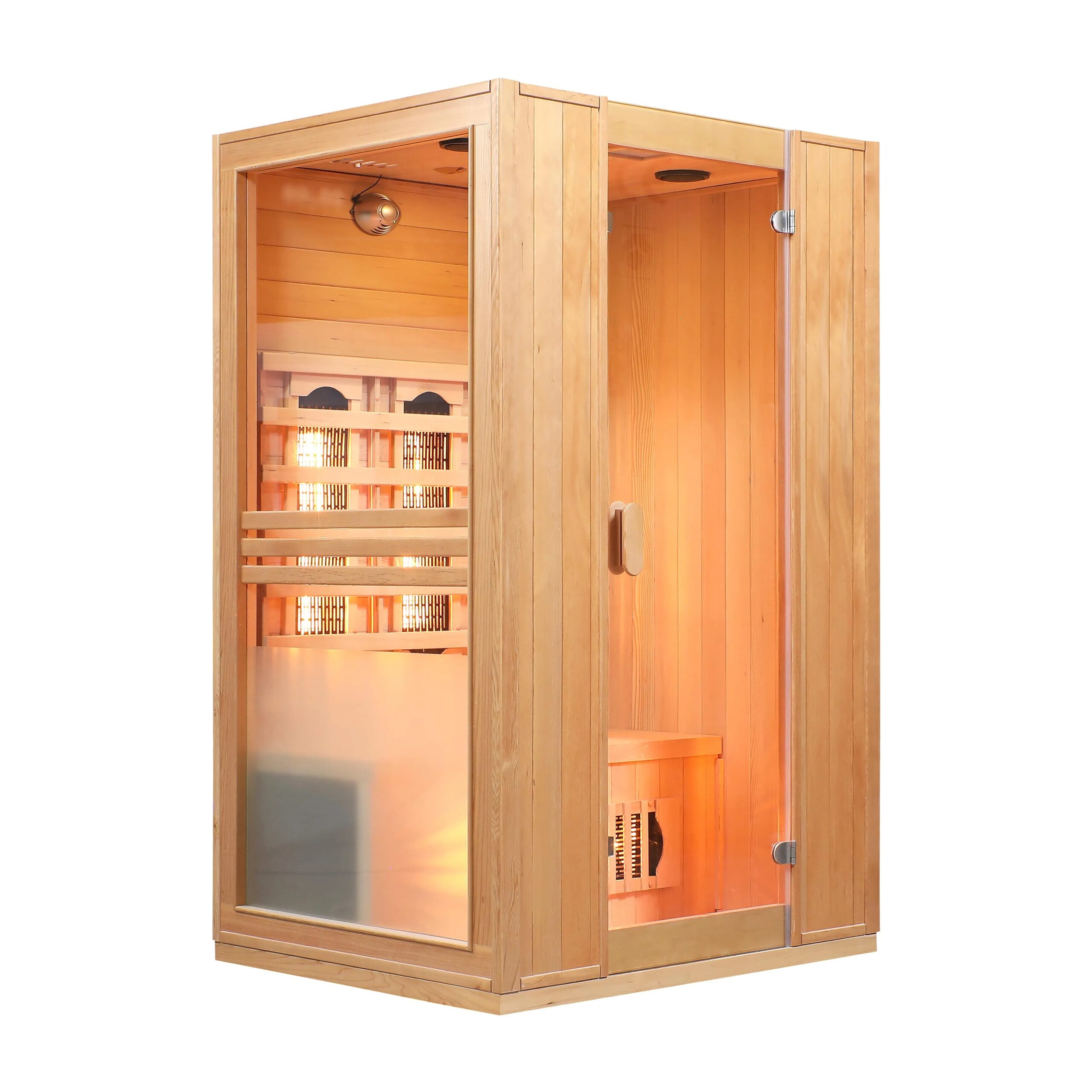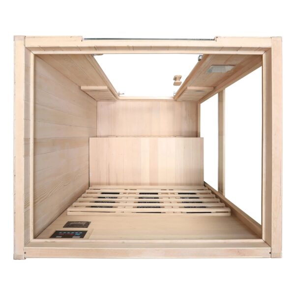 The warm, natural ambiance created by the Hemlock wood interior is complemented by modern features such as a digital control panel, audio system, and external reading light. A built-in ionizer with ozone function improves air quality by removing dust, bacteria, and allergens.