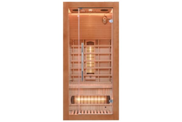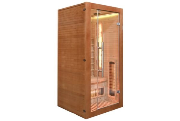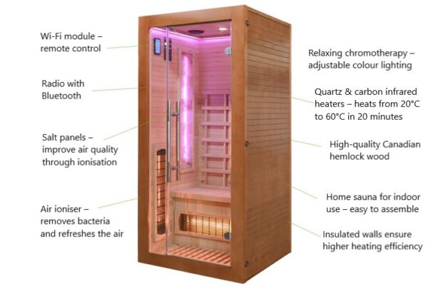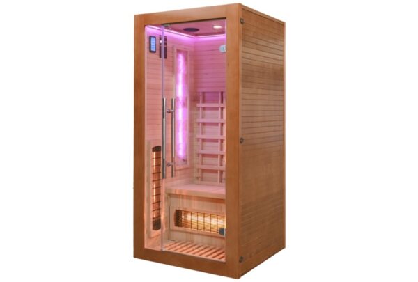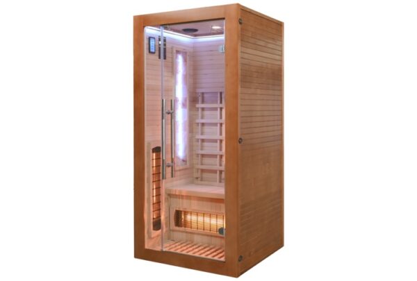The brown infrared sauna is designed for one person. It has compact dimensions (900 × 900 × 1900 mm), making it a great solution even for limited spaces.