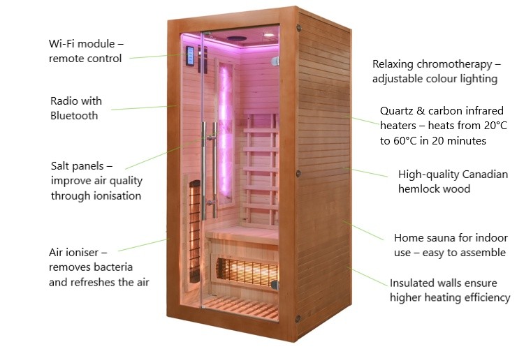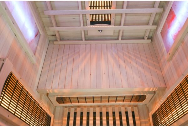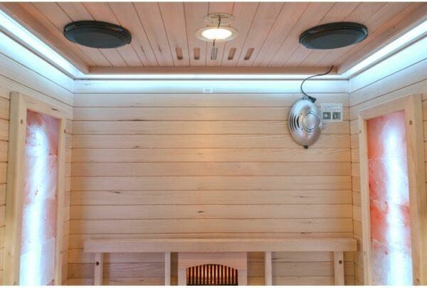 The sauna includes chromotherapy, allowing you to set the frequency of multicoloured lights for a calming effect.