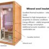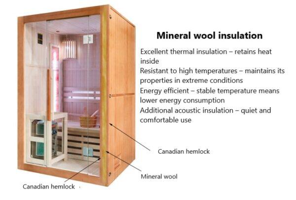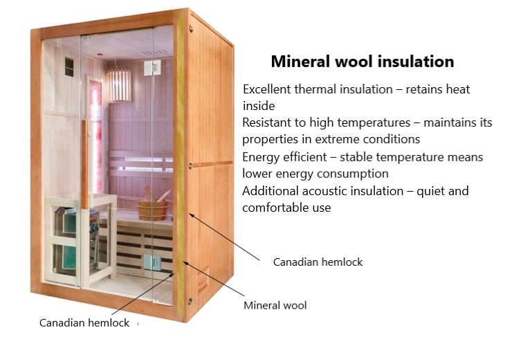 The walls of our indoor saunas are made of Canadian hemlock wood, and the space between the inner and outer layers is filled with mineral wool insulation. Thanks to its fire resistance, moisture resistance, and vapour permeability, it helps provide safety and comfortable conditions, while supporting economical sauna use.
