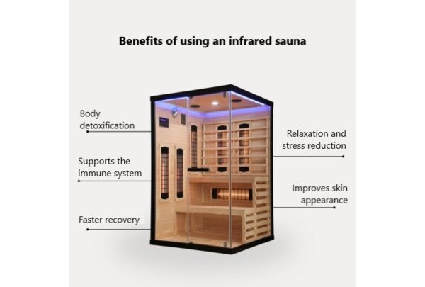 The cabin allows sessions at temperatures up to 60°C. Low-temperature infrared saunas can be used daily – for relaxation, improved immunity, and overall well-being. Sessions are often chosen by people who experience headaches or muscle soreness after intensive training. Regular sauna use may also support skin conditions, including concerns such as cellulite or post-acne marks.