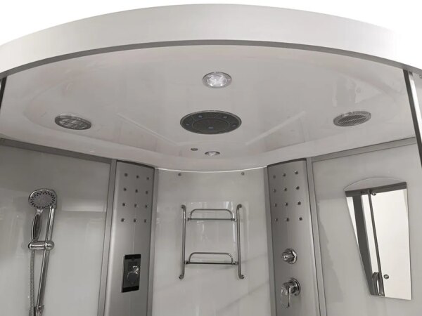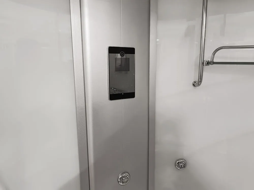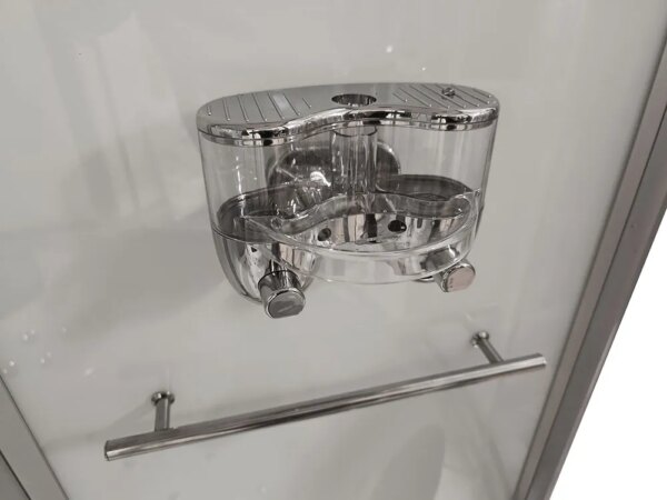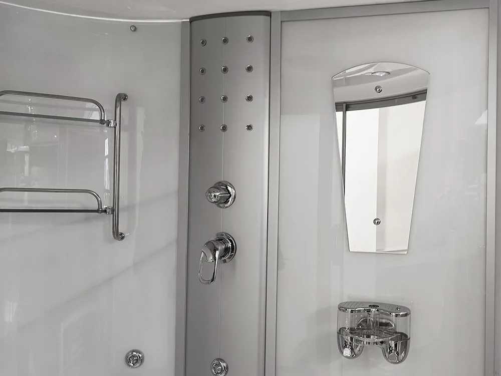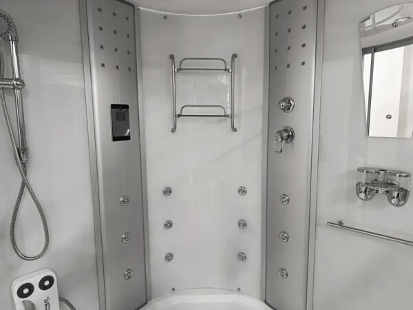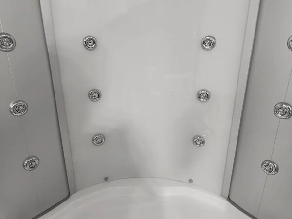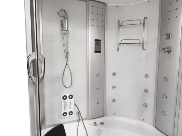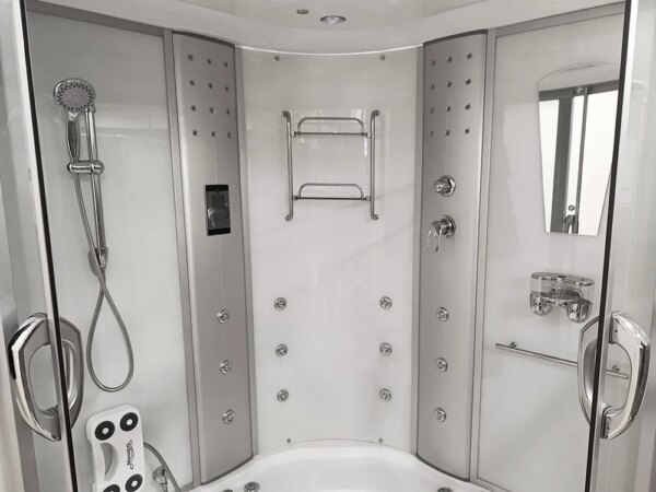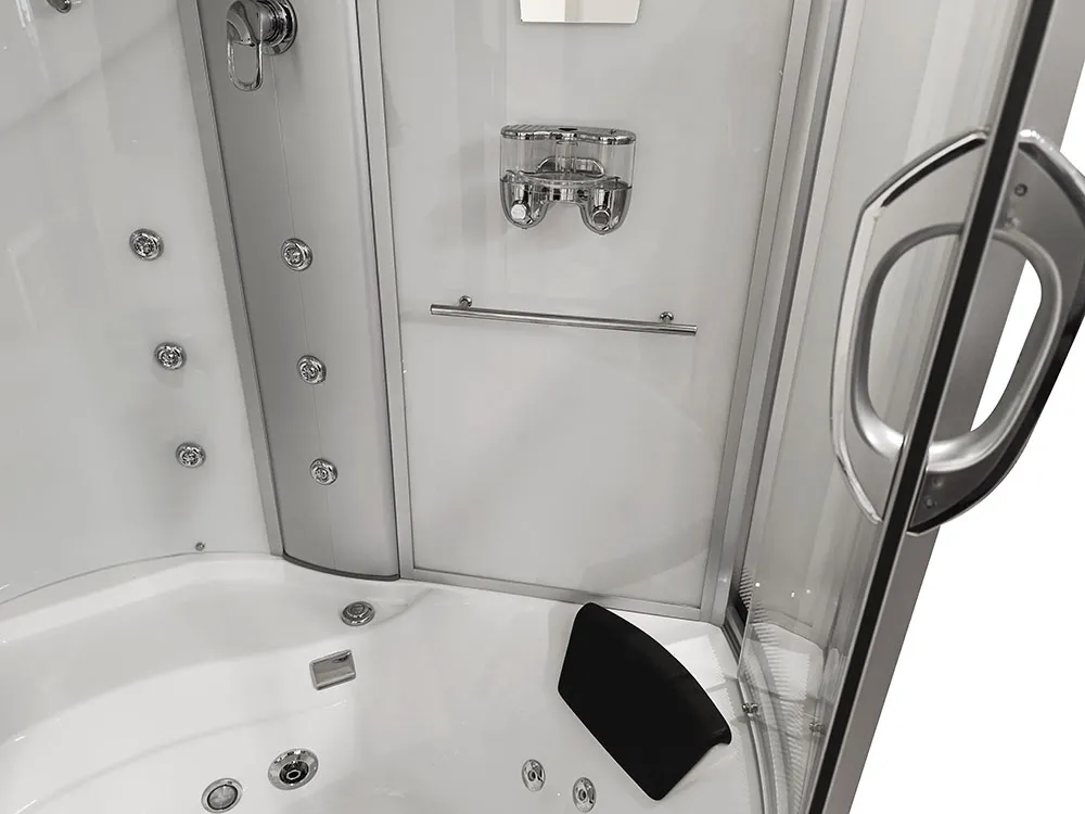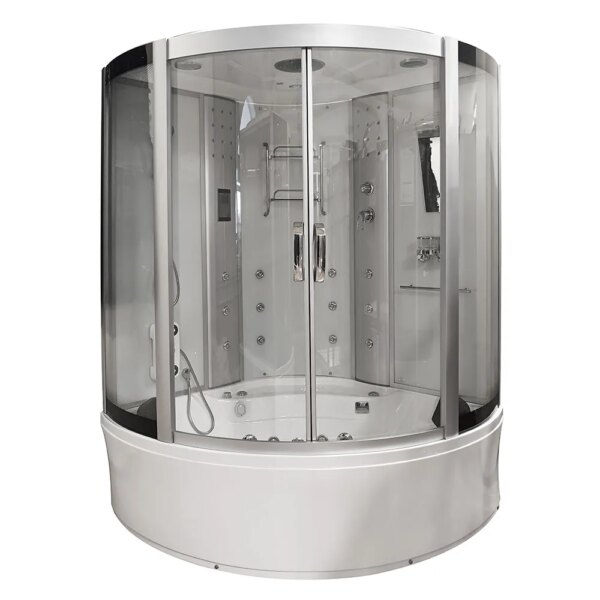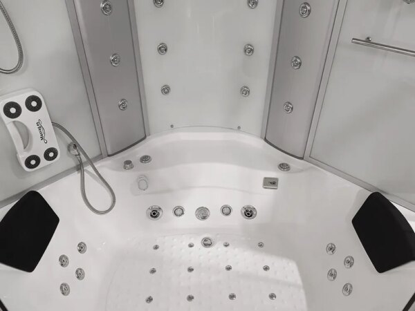 Bathtubs combine the functions of a shower cabin and a bathtub. The bathtub has a water pump, an air pump, and underwater lighting. The cabin contains all the functions of a rain shower, a showerhead, shelves for cosmetics, and a jet for back massage.