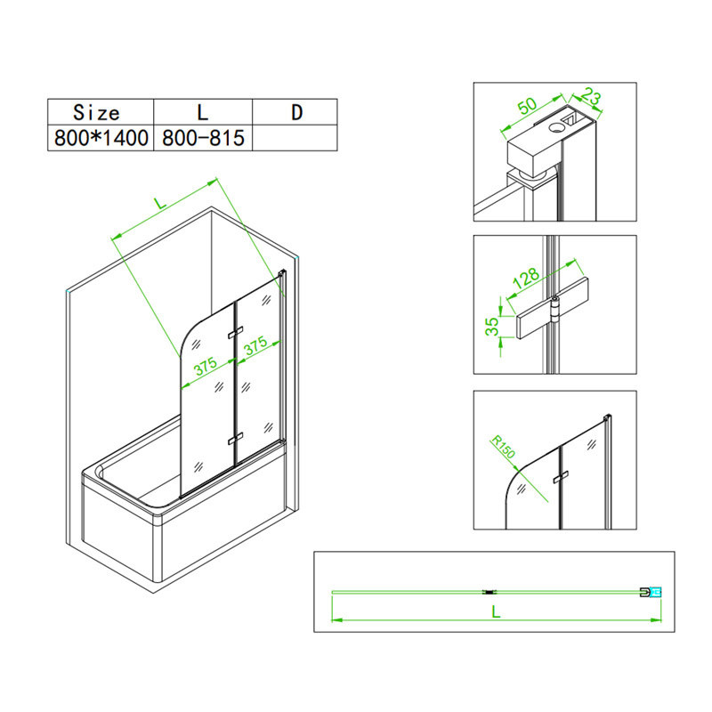 Bathtub shower screen 800x1400mm B-PR04 Chrome glass 6mm