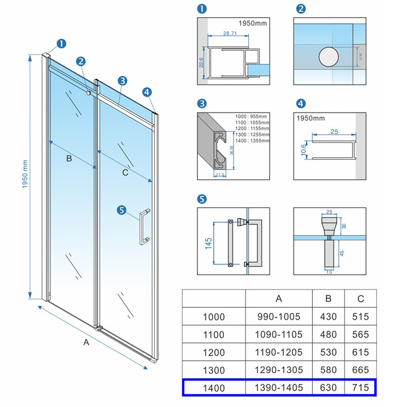 - Possibility to adjust the length of the shower door to smaller sizes by up to 50mm! The upper profile should be shortened by yourself ONLY AND ONLY from the side of the door (the rail on which the rollers run, by cutting it to any length).
